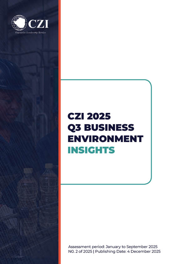The CZI Quarterly Business Environment Insights is published quarterly to assess business performance under the obtaining policy environment. The report provides trends and insights into the business environment, informed by both local and international developments. The publication is designed to inform the market and policymakers about market developments and performance, ensuring that changes in the policy environment and their impact on business are monitored consistently.